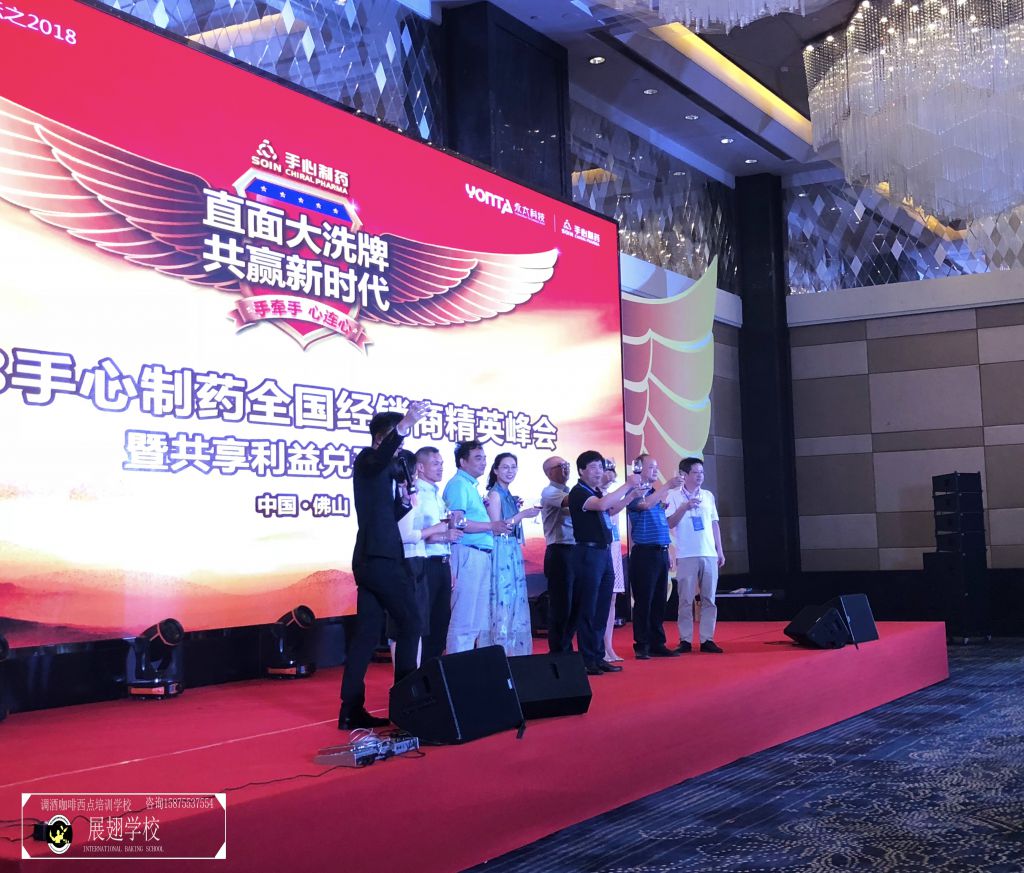 7月20日,2018手心制藥全國經銷商精英峰會暨共享利益兌現峰會在廣東佛山隆重舉行,佛山展翅咖啡調酒西點培訓學?;ㄊ秸{酒師張韋杰先生受邀為本次峰會進行花式調酒演出。